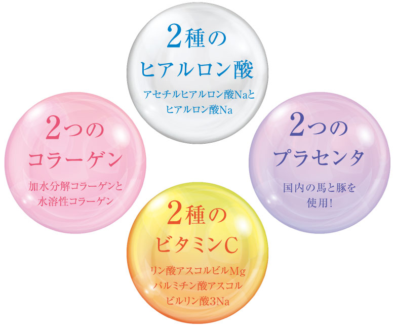 2種のヒアルロン酸※1や、分子量の違う2つのコラーゲン※2、国内の馬と豚を使った2つのプラセンタエキスなどの美肌成分を配合し、触れたくなるようなぷるぷるお肌に!